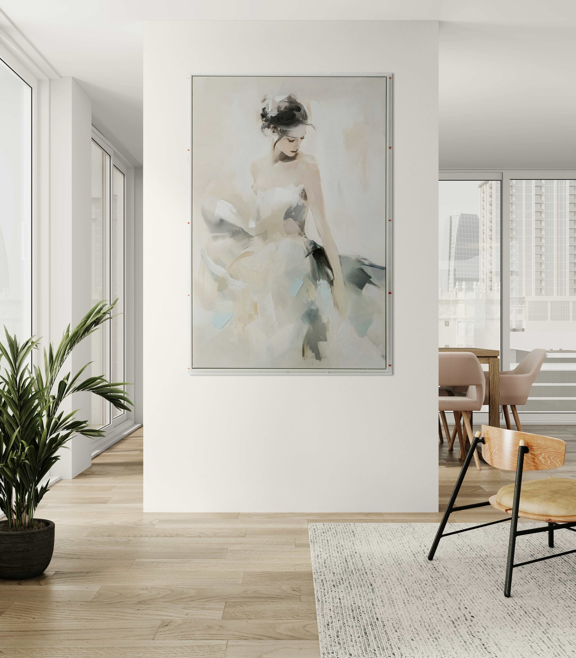 A graceful figure captured in soft, flowing tones, expressing calm, beauty, and femininity. The abstract brushwork creates movement and lightness across the canvas.