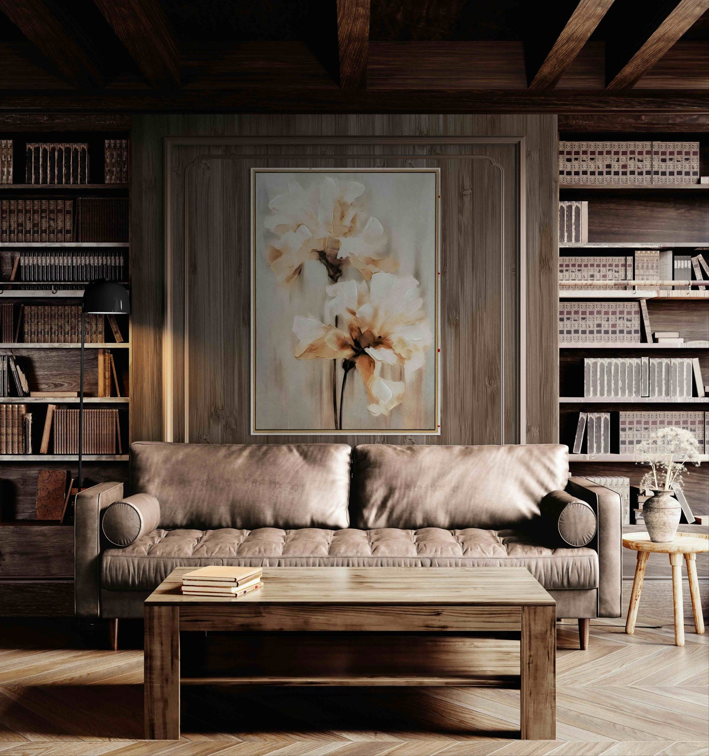Gentle blooms emerge in warm neutral tones, creating a soothing and elegant presence. Hand-painted textures add depth and softness, making this artwork perfect for refined interiors.