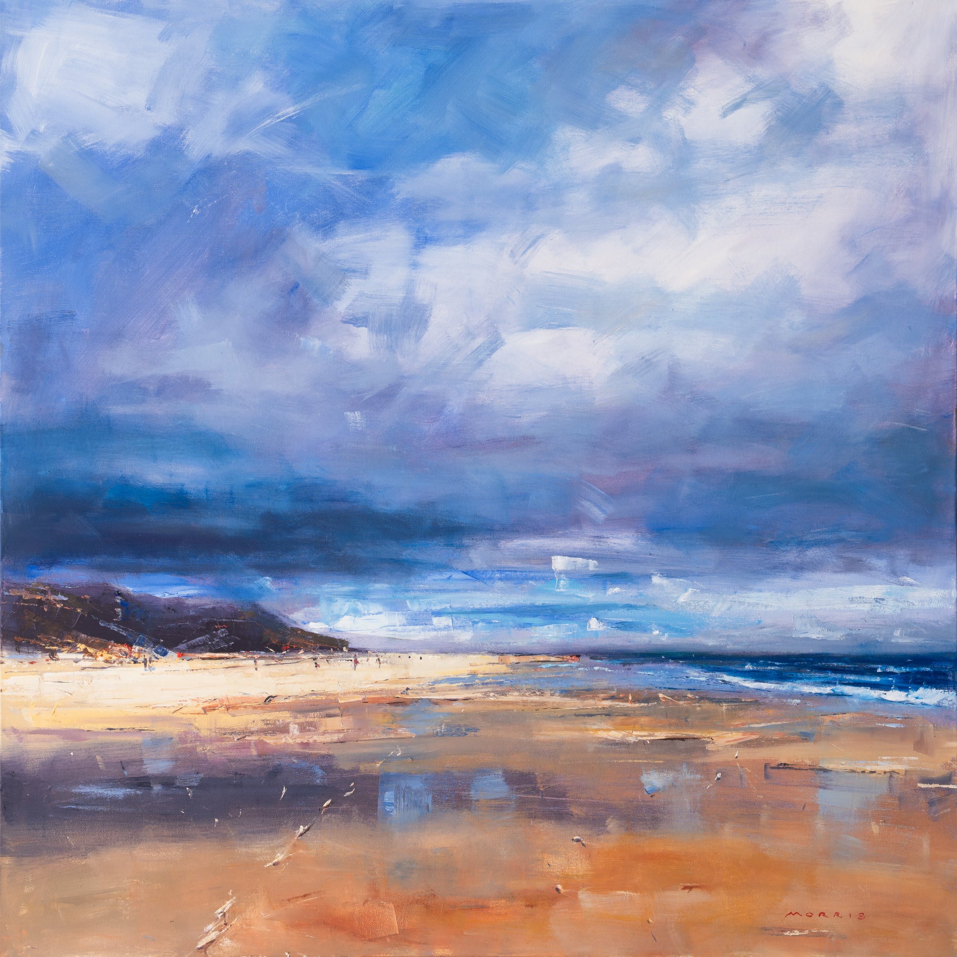 This oil painting features soft hues of blue and golden yellow, capturing the serene beauty of a morning by the shore. The interplay of light and its reflection on the water creates a tranquil and poetic scene, evoking the feeling of being embraced by nature. Perfect for living rooms or study spaces, it brings a calming and relaxing ambiance.