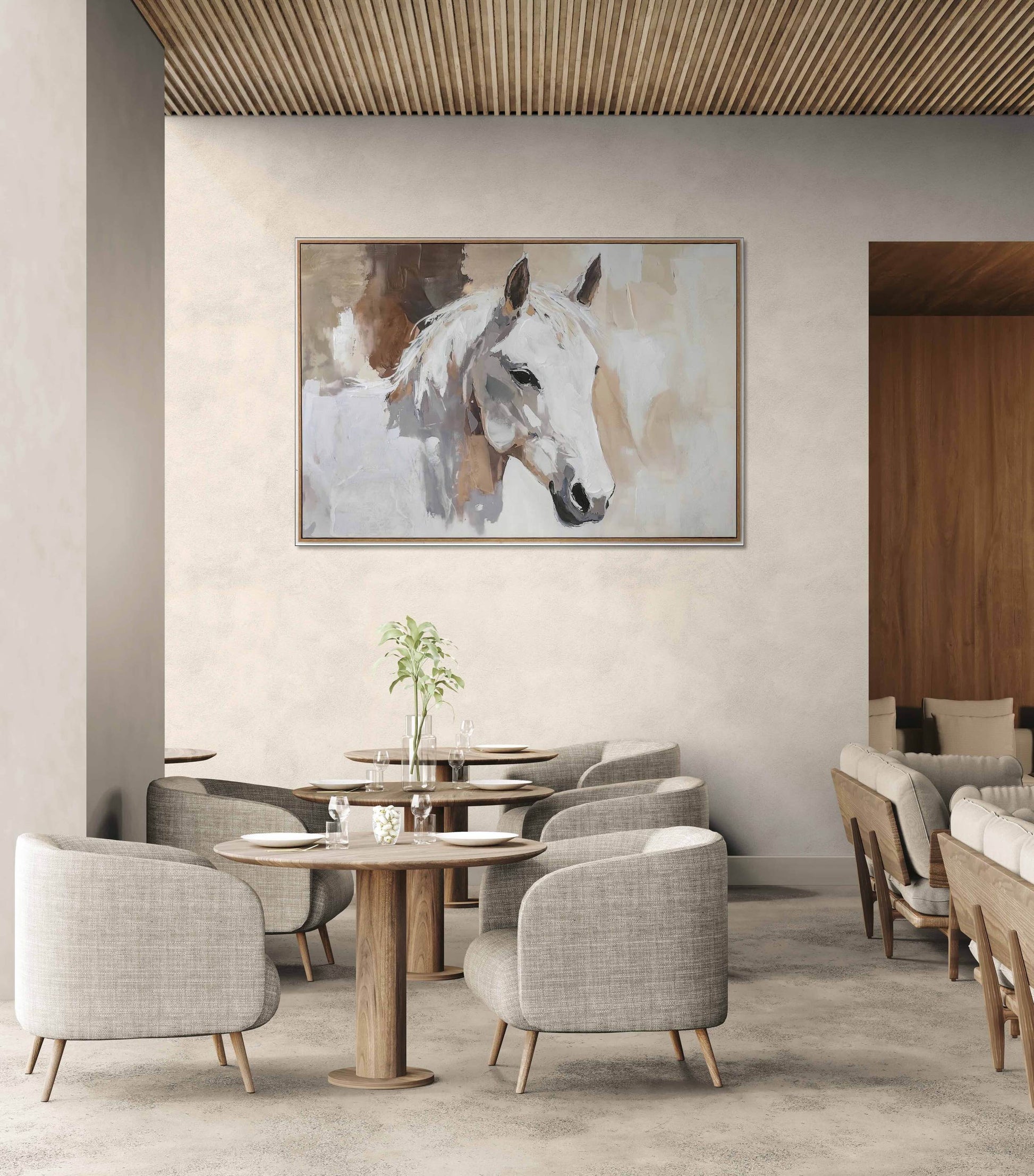 A majestic white horse portrayed with soft, expressive strokes in serene neutral tones. Its calm presence brings quiet strength and sophistication to the room.